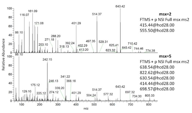 典型 msxDIA 二級質(zhì)譜圖如圖 12 所示,每張譜圖包含 2 個(2 x 10 m/z 模式)或 5 個(5 x 4 m/z 模式)窗口的碎片信息,即一次掃描采集 2 個或 5 個窗口,分析效率顯著提高,選擇性也因窗口縮小而明顯改善。