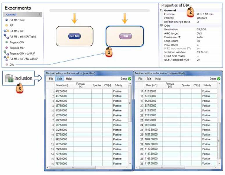 Q Exactive 的 DIA 方法編輯簡單、易上手,流程一目了然,無需任何 DIA 分析經(jīng)驗。僅三步,即可完成全部方法設(shè)置(圖 9):(1)在模板中將 DIA 模塊拖入方法流程(若加入一級掃描,則在 DIA 模塊前拖入 Full Mass 模塊);(2) 根據(jù)需要修改 DIA 模塊中的分辨率(通常設(shè) 35000)和窗口寬度(若實際窗口步長為 25 m/z ,則設(shè) 26 m/z ,多 1 m/z 為窗口之間 Overlap);(3) Inclusion List中生成每個窗口的中間值(m/z )作為 target。三步完成后保存方法,即刻開始樣品數(shù)據(jù)采集。