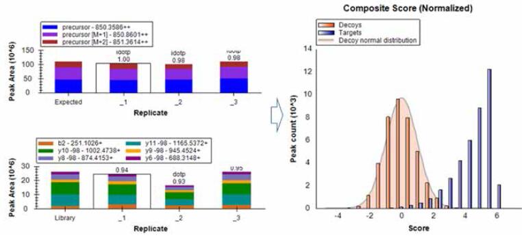 使用 Skyline 內(nèi)嵌的 mProphet 卡值工具對譜圖匹配結(jié)果進(jìn)行統(tǒng)計學(xué)分析,綜合考慮 dotp 分?jǐn)?shù)、信號響應(yīng)、保留時間、質(zhì)量偏差等因素計算 q 值,過濾結(jié)果,獲得高度可信的肽段定性結(jié)果(q < 0.01)(圖 14)。