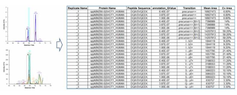 經(jīng)定性卡值(q < 0.01)后,最終獲得所有可靠離子對的色譜峰面積和 CV 值,將結(jié)果以 Excel 表格式導(dǎo)出,使用 CV < 20% 的離子對峰面積進(jìn)行定量分析,完成 DIA 分析工作(圖 15)。