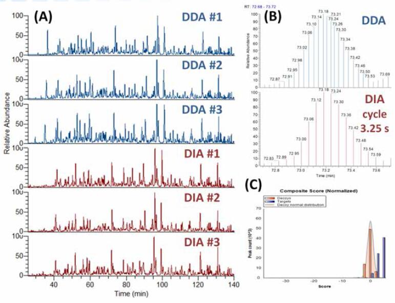 FIGURE 2. Comparison of DDA and DIA raw data. (A) Comparison of MS1 base peak chromatograms. (B) Comparison of zoomedin chromatograms. (C) Composite score distribution of targets and decoys of DIA data.