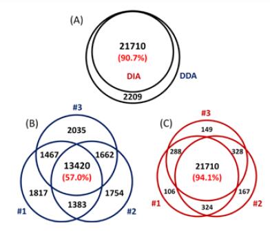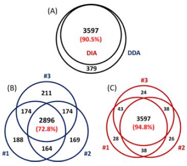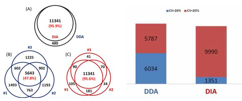 FIGURE 4. Sensitivity and reproducibility of protein ID results of DDA and DIA. (A) More than 90% of library proteins (DDA result) can be identified from all three replicates of DIA. The ID reproducibility of DIA (C) is also better than DDA (B).