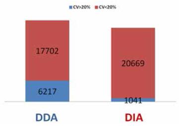 FIGURE 5. Comparison of peptide number with CV of transition/precursor peak area < 20% (red) or > 20% (blue). The quantification performance of DIA is much higher than DDA.