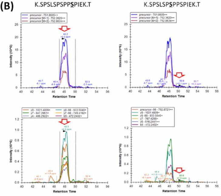 FIGURE 8. Example peptides with identical sequence and mass but different phosphorylation site. (A) Correct peak assignment was obtained due to high data quality.