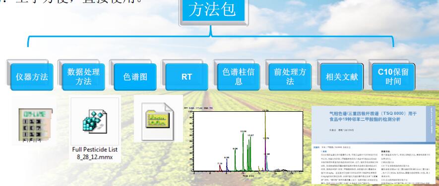 方法包包括進(jìn)樣方法、數(shù)據(jù)處理方法(TraceFinder 方法文件夾)、相關(guān)應(yīng)用文章、相關(guān)標(biāo)準(zhǔn)、色譜柱信息、前處理方法、數(shù)據(jù)文件等,客戶可以直接調(diào)用進(jìn)樣方法和數(shù)據(jù)處理方法完成化合物的定性定量分析。