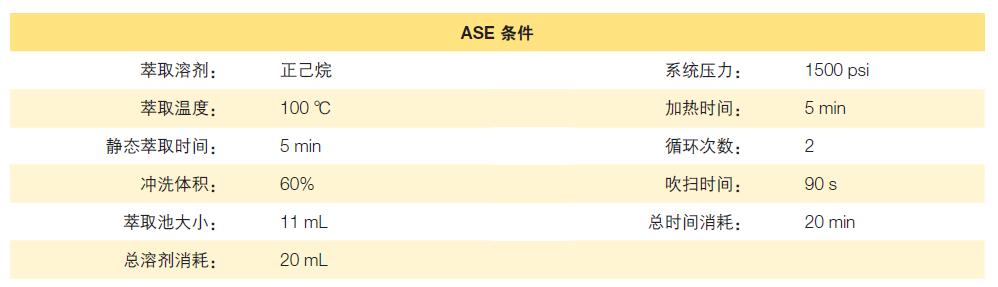 設(shè)備:Thermo ScientificTM DionexTM ASETM 350 加速溶劑萃取,配 10 mL 不銹鋼萃取池(P/N 068087),60 mL 收集瓶(P/N 048784)Thermo ScientificTM Reacti-Therm 氮吹儀(PN: 1003290002-00)。