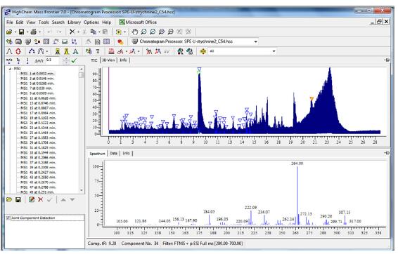 采用Mass Frontier的聯合組分檢測(Joint Components Detection)算法,對質譜數據中的代表性組分進行查找。基于所有離子輪廓圖最大值的統計分析,通過提取各個質譜峰豐度輪廓圖,可創建出士的寧母藥及其他可能代謝物的“純凈”質譜樹,并生成相應的峰形(圖1)。