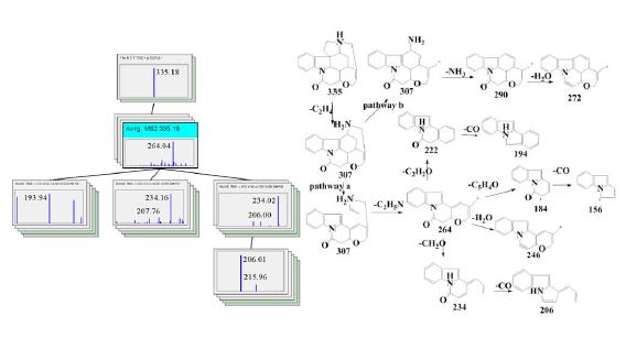 LTQ Orbitrap XL的線性離子阱相比傳統三維離子阱具有更高的離子容量,故具有優異的多級質譜能力,能夠高效的捕獲前級離子進行碎裂,并獲得高靈敏度的碎片離子信息,在對士的寧母離子的采集過程中,獲得了其四級有效質譜信息(MS4)。通過多級質譜解析,總結出士的寧完整裂解機理,為未知代謝物檢索帶來有價值的信息(圖3)。