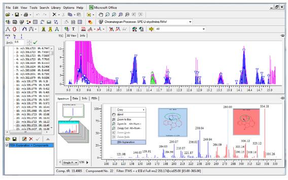 4.2 Mass Frontier為Thermo專業的結構解析軟件,利用其豐富的碎裂數據庫(Fragmentation Library),可快速的對士的寧多級碎片結構進行了準確推測和歸屬,在快速解析碎片的同時,可獲得完整的碎片裂解途徑,并可方便的調用查看所引用的文獻情況,保證了碎片解析的準確性。母藥和代謝物存在結構相關性,質譜多級碎裂后可能生成共有碎片,碎片離子檢索(FISh)功能將這種相關性與可能的代謝途徑有機的結合起來,從繁雜的基質樣品質譜信號中準確的篩選到未知代謝物信息,通過比對母藥和代謝物多級質譜信息, FISh解釋功能更可進一步對代謝位點進行推測。