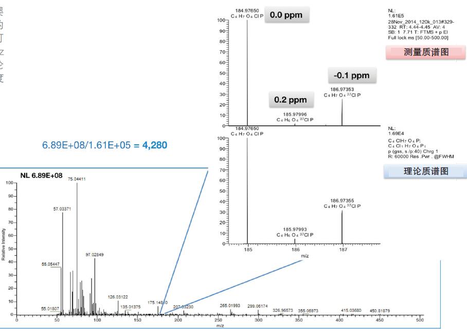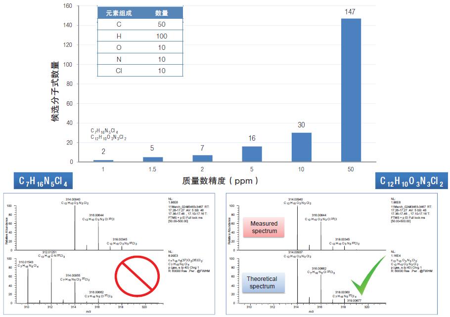 作為對比,< 1 ppm 的質量數精度窗口只為該質量數給出兩個可能的元素組成。為了進一步區分這兩個分子式,可以比較測量每個候選分子式的理論同位素分布和測量同位素分布。