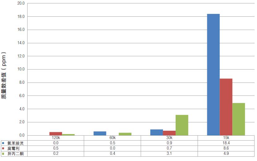 圖 3. 加標 10 ng/g 農藥的韭菜樣品中,分辨率(m/z 200 下)對于氯苯胺靈、腐霉利和異丙二酮測量質量數精度的影響。高于 30k 的分辨率可以將這些農藥和干擾基質離子完全分開,提供小于 1 ppm 的質量數精度。