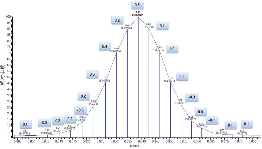 在整個色譜峰范圍內,從峰起點掃描到峰頂點掃描,Q Exactive GC 系統都可提供 < 1 ppm 的常規穩定質量數精度(內標校正)。