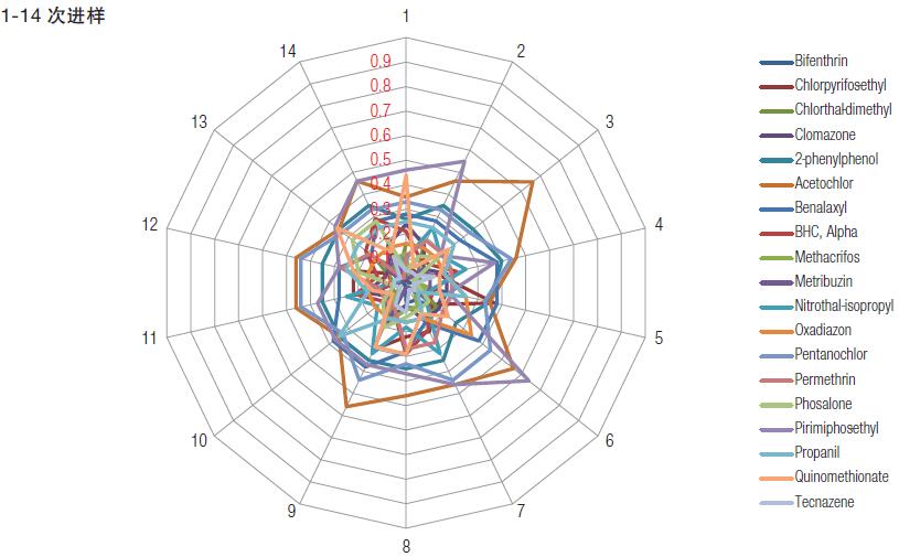圖 6. 加標 5 ng/g 農殘化合物的嬰兒食品樣品的 14 次重復進樣的質量數精度