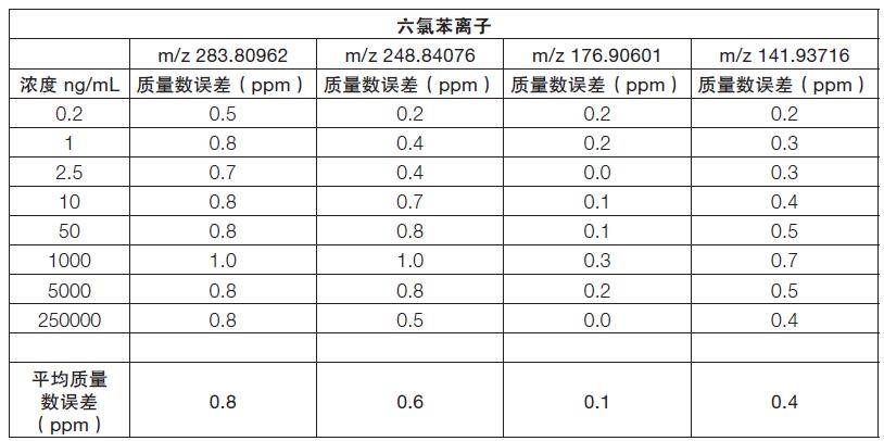 測試范圍超過五個數量級(0.1 ng/mL 到 250,000 ng/mL)。表 2 提供了六氯苯生成的四個離子的質量數精度測量。