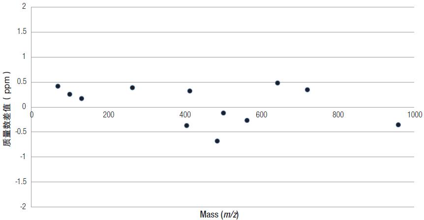 圖 8 和圖 9 可以證實,69–960 Da 的質量數范圍內,測量數據均具有亞 ppm 級的質量數精度。