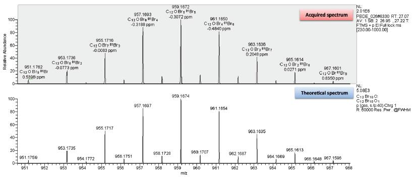 圖 9. deca-BDE 分子離子簇(C12Br10O)高質量數的質量數精度(0.6 ppm RMS)。60k 分辨率下以全掃描模式采集數據。