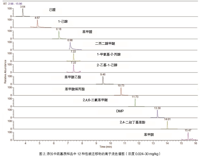 在本次測(cè)試中,應(yīng)用自動(dòng)SPME對(duì)卡紙中12種代表性的可能遷移物(鄰苯二甲酸鹽、光引發(fā)劑、苯酚和異味成分)進(jìn)行了定量分析。