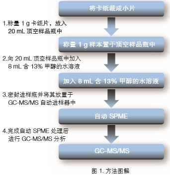 將卡紙樣本裁成小片(2 mm × 2 mm),并稱重 1 g 置于 20 mL 頂空樣品瓶中。向各樣品瓶中分別加入 8 mL 含 13% 甲醇的水溶液。密封樣品瓶并將其放置在自動(dòng)進(jìn)樣盤上。一旦樣品瓶放置 于樣品盤上,即進(jìn)入 SPME 處理程序,之后經(jīng)由 GC-MS/MS 分 析,詳見圖 1。