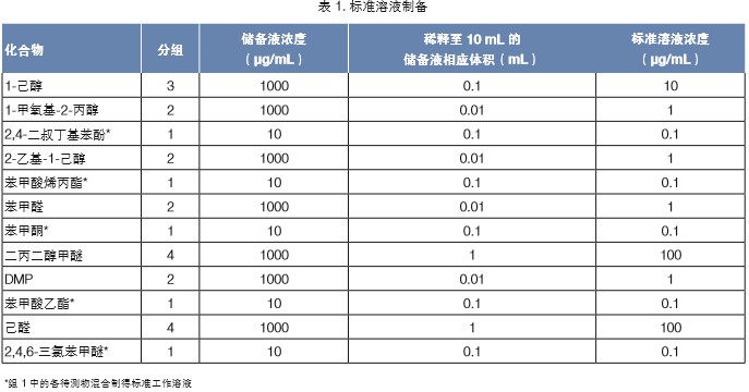 通過分別稀釋七種待測(cè)物(1-己醇、1-甲氧基-2-丙醇、2-乙 基-1-己醇、苯甲醛、二丙二醇甲醚、DMP 和己醛)的儲(chǔ)備液和標(biāo)準(zhǔn)工作溶液制得標(biāo)準(zhǔn)溶液,溶劑為水。將待測(cè)物以不同濃度分為四組(表 1)。所有標(biāo)準(zhǔn)溶液均為測(cè)試前新鮮配制。