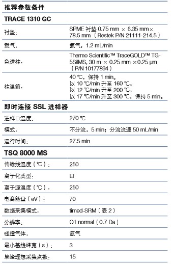 本次實(shí)驗(yàn)應(yīng)用 Thermo Scientific™ TSQ™ 8000 GC-MS/MS 質(zhì) 譜儀聯(lián)用配備有 Thermo Scientific™ TriPlus™ RSH 自動(dòng)進(jìn)樣 器和 SPME(SPME NL: 50.5 mm)模塊的 Thermo Scientific™ TRACE™ 1310 氣相色譜儀系統(tǒng)進(jìn)行測(cè)試分析。氣相色譜分離采 用 Thermo Scientific™ TraceGOLD™ TG-5SilMS 色譜柱(30 m × 0.25 mm × 0.25 µm, P/N 10177894)。用于定量和確證的原始數(shù) 據(jù)則通過 Thermo Scientific™ TraceFinder™ 3.2 軟件中的智能定時(shí) 掃描(timed-SRM)模塊采集。