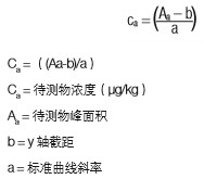 定量測(cè)試采用基質(zhì)添加標(biāo)準(zhǔn)樣本進(jìn)行標(biāo)準(zhǔn)曲線計(jì)算。根據(jù)各待測(cè)物的峰面積與其濃度線性相關(guān)關(guān)系計(jì)算標(biāo)準(zhǔn)曲線。依據(jù)以下公式計(jì)算樣品中待測(cè)物濃度: