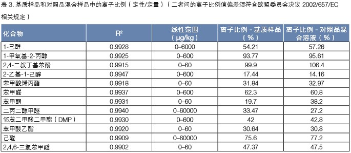 應(yīng)用 SRM 模式進(jìn)行檢測(cè),專屬性測(cè)試主要通過檢測(cè)各待測(cè)物在正確色譜保留時(shí)間內(nèi)出現(xiàn)的特定產(chǎn)物離子(定量離子和定性離 子)來驗(yàn)證。檢測(cè)到的定量離子/定性離子峰面積比值與標(biāo)準(zhǔn)樣 品的測(cè)試結(jié)果(表 3)偏差須符合歐盟委員會(huì)決議 2002/657/EC 相關(guān)規(guī)定。