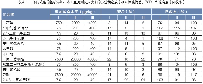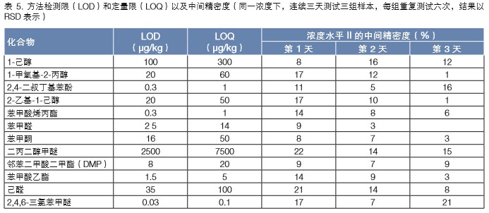 通過分別分析三個(gè)不同濃度的添加原始卡紙樣本驗(yàn)證方法精密度(重復(fù)性)。在同一天內(nèi),三個(gè)不同濃度水平樣本分別重復(fù)測(cè)試六次。另外,同時(shí)對(duì)其中一組再重復(fù)測(cè)試兩套,并在之后連續(xù)兩 天進(jìn)行三套測(cè)試,以完成中間精密度驗(yàn)證。結(jié)果見表 4 和表 5。 除了揮發(fā)性較差的化合物(例如 2,4,6-三氯苯甲醚)外,各待測(cè)物重復(fù)性均在正常偏差范圍內(nèi)。