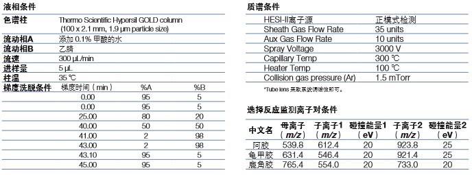綜上所述,由 Thermo ScientificTM TSQ Quantum Access MAXTM 三重四極桿質(zhì)譜儀和 UltiMate™ 3000 Rapid Separation LC Systems 快速分離液相系統(tǒng)構(gòu)成的高效液相色譜-質(zhì)譜聯(lián)用儀系統(tǒng)完全可以滿足《中國藥典》 2 0 1 5 年版對于中藥材阿膠、鹿角膠、龜甲 膠鑒別方法的要求。