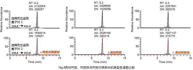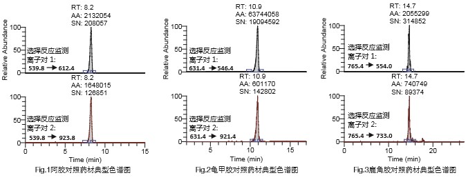 可以觀察到下圖中,F(xiàn)ig.4B 藥材阿膠(購自北京同仁堂)和 Fig.4C 藥材阿膠珠(購自北京同仁堂)的色譜峰信噪比均應(yīng)大于 3:1, 并同時(shí)呈現(xiàn)與 Fig.4A 阿膠對照藥材色譜保留時(shí)間一致的色譜峰。