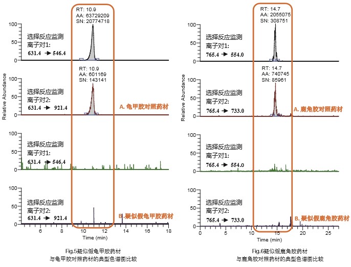 可以觀察到下圖中,F(xiàn)ig.5B 疑似假龜甲膠藥材(購自某藥材市場)色譜圖中,不存在與 Fig.5A 龜甲膠對照藥材色譜保留時(shí)間一致 的色譜峰;同理,F(xiàn)ig.6B 疑似假鹿角膠藥材(購自某藥材市場)色譜圖中,并不存在與 Fig.6A 龜甲膠對照藥材色譜保留時(shí)間一致 的色譜峰。