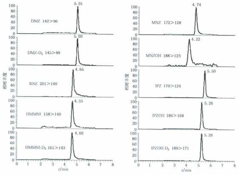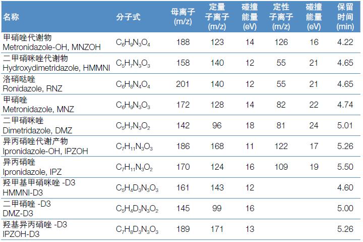 硝基咪唑類(5-nitroimidazoles)藥物是一類具有5- 硝基咪唑環結構的藥物,具有抗原蟲和抗菌活性, 日常檢測涉及畜禽、水產、蜂產品、奶制品等動物源性樣品。本文參考SN/T 1928-2007、GB/T 21318-2007、GB/T 22949-2008、GB/T 21995-2008、農業部1025 號公告-22-2008、農業部1486 號公告-4-2010、SN/T 2579-2010,簡化自GB/T 23410-2009、GB/T 23407-2009、GB/T 23406-2009, 是一個快速檢測多種硝基咪唑類藥物殘留量的儀器方法,內標法定量。