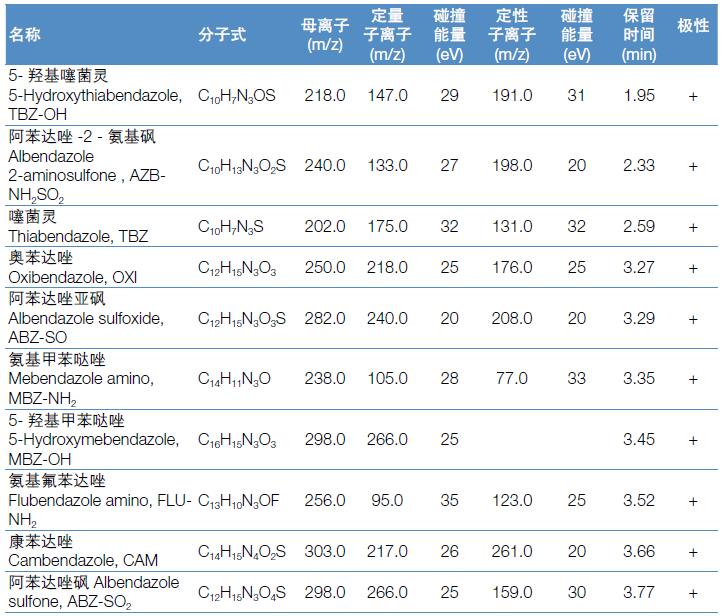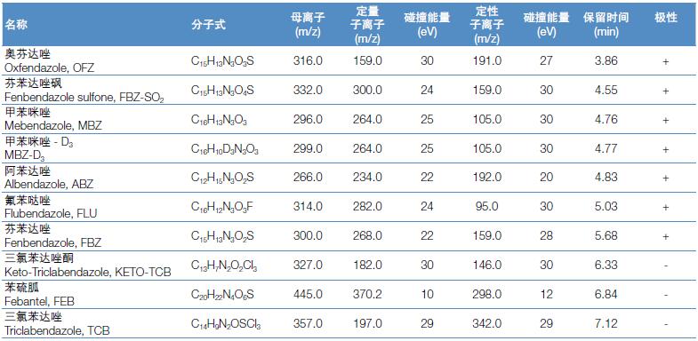 上述國標檢測方法中,苯并咪唑類藥物在不同基質中的檢出限為10.0-500.0 μg/kg。本方法完全能夠滿足國內和國際法規標準對于常規法規檢測方法靈敏度、重現性的要求。