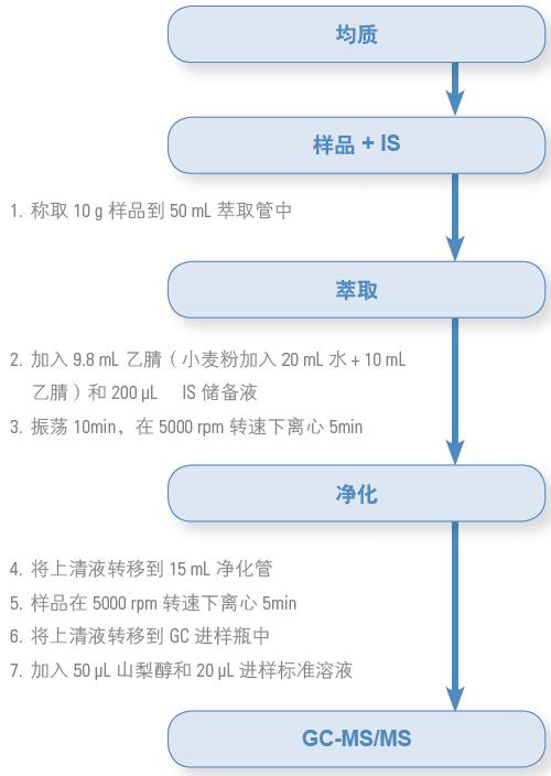 取出部分事先均質好的樣品(對一些不穩定的化合物,建議在低溫下研磨),采用標準的QuEChERS 方法(萃取和凈化)進行樣品前處理,然后進樣到TSQ 8000 Triple-Stage Quadrupole GC-MS/MS 系統5,6。