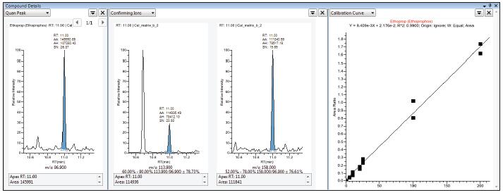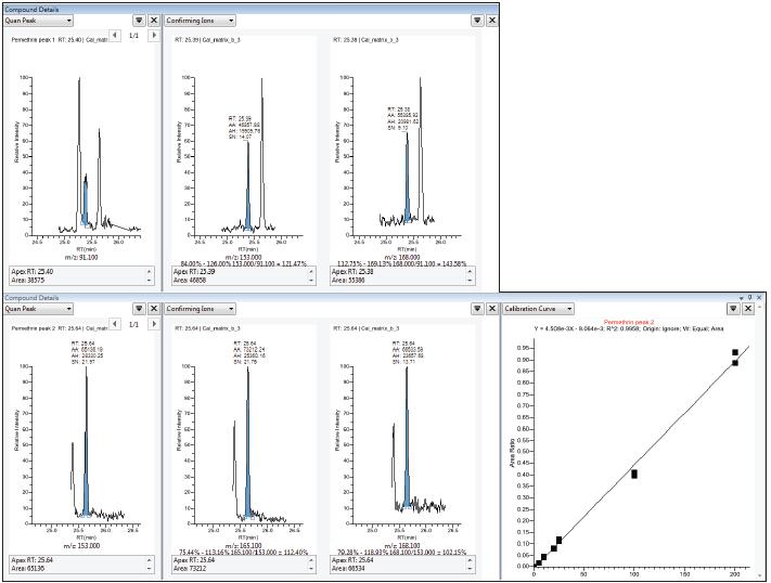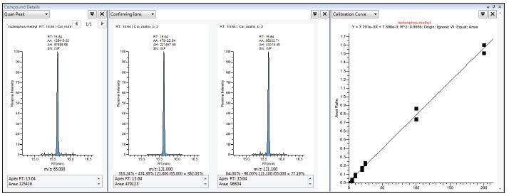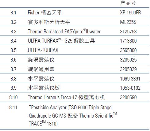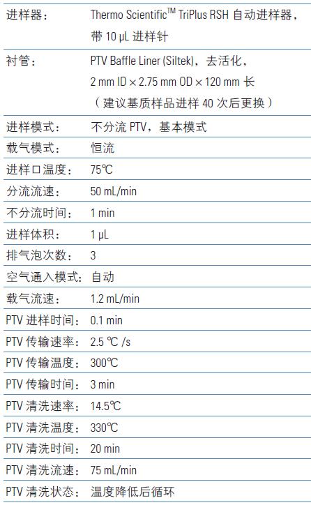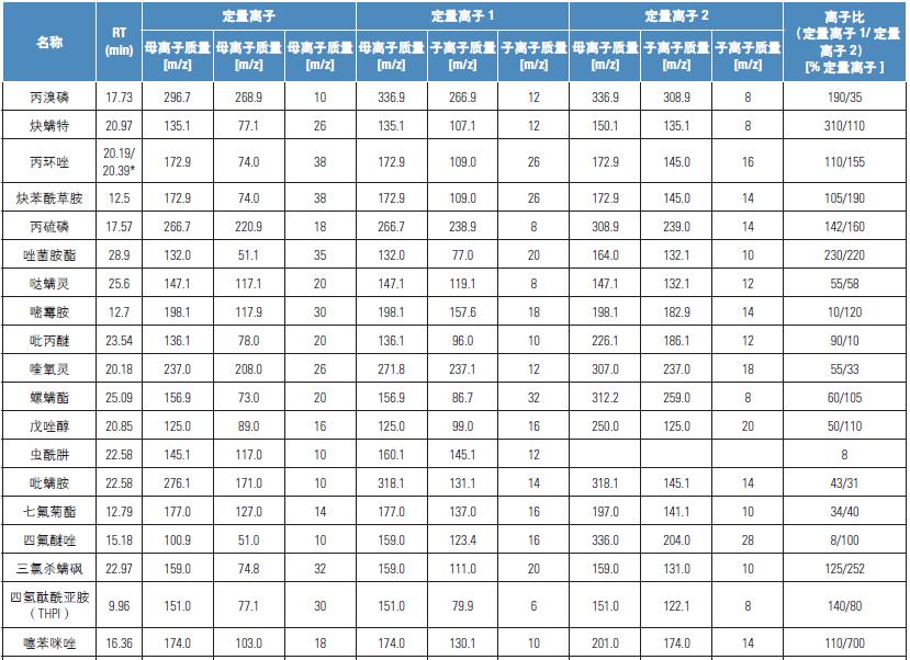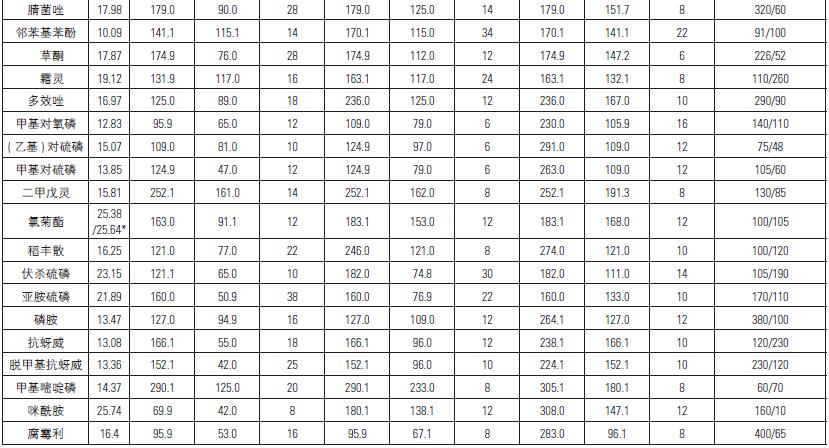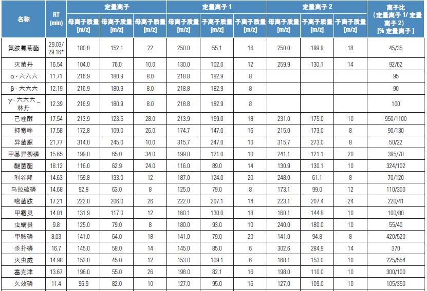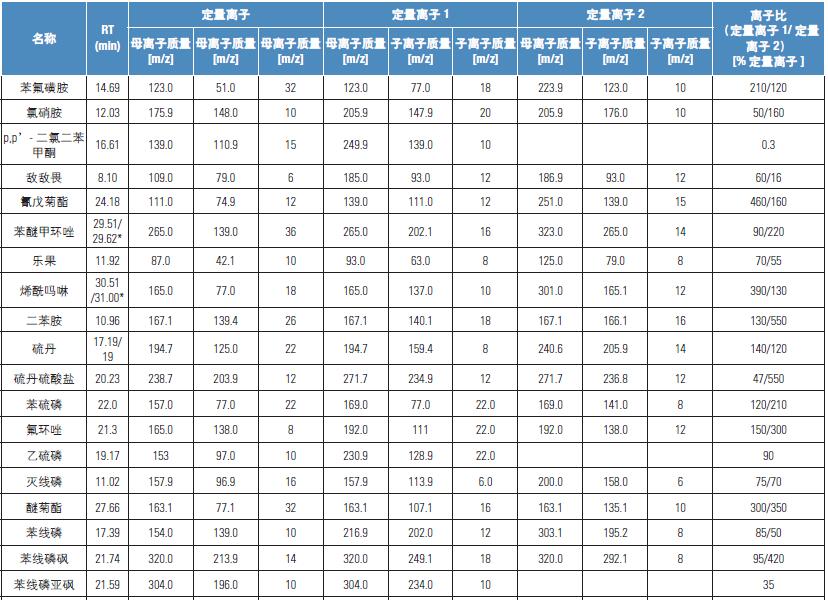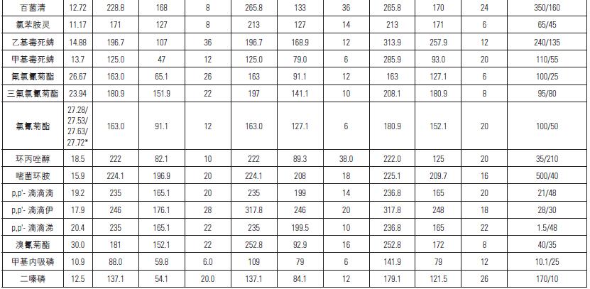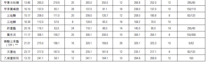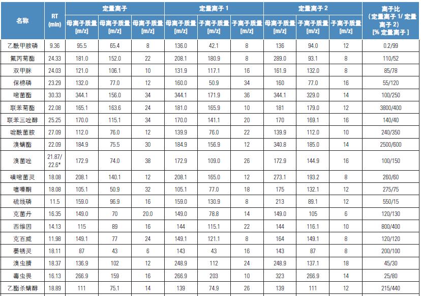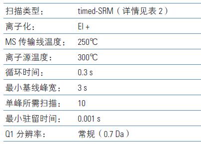 質譜檢測使用TSQ 8000 三重四極桿質譜儀的Timed-SRM 模式完成。所有的方法和SRM 設置來自Thermo Scientific TSQ8000 Pesticide Analyzer 系統6。離子比值根據每種待測基質進行修改和設置。