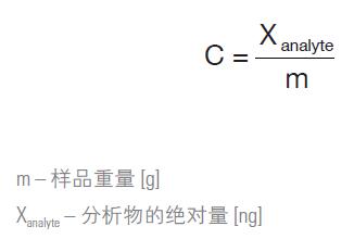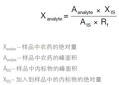 目標農藥的定量采用內標法。相對響應因子(Rf)的定義見如下列方程。按照如下方程計算最終結果。