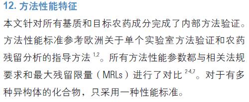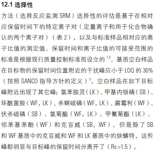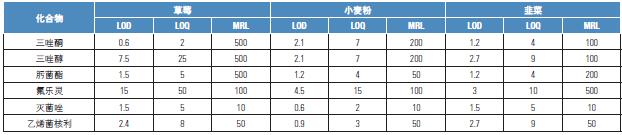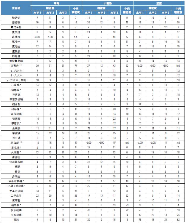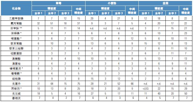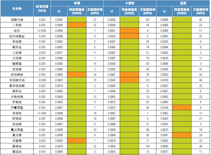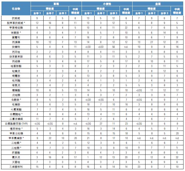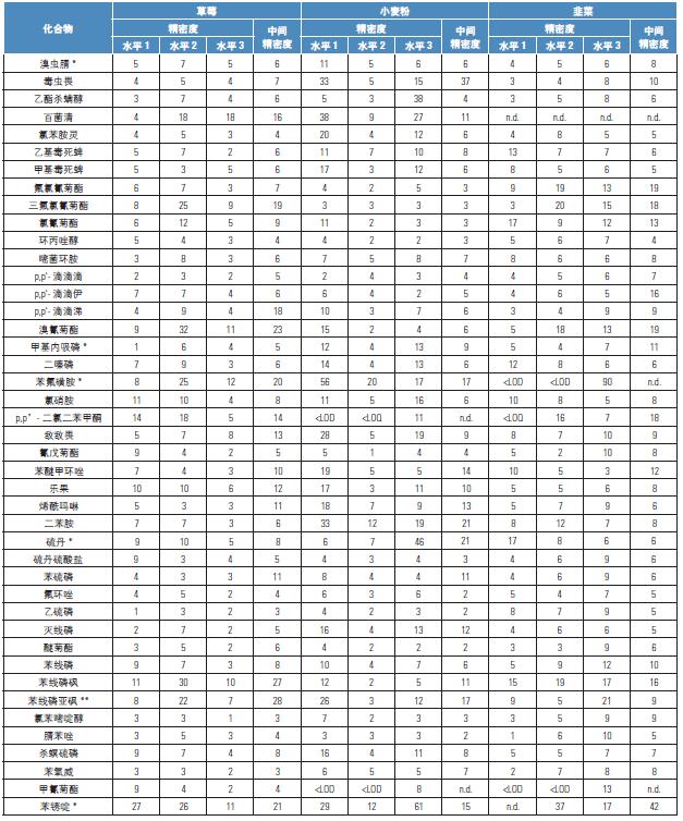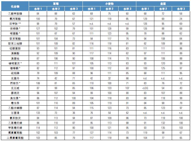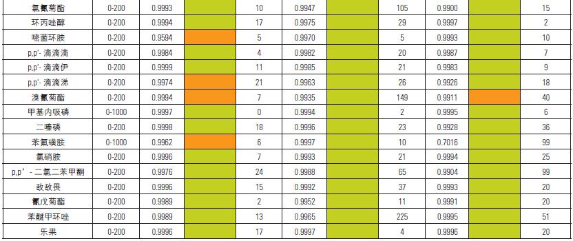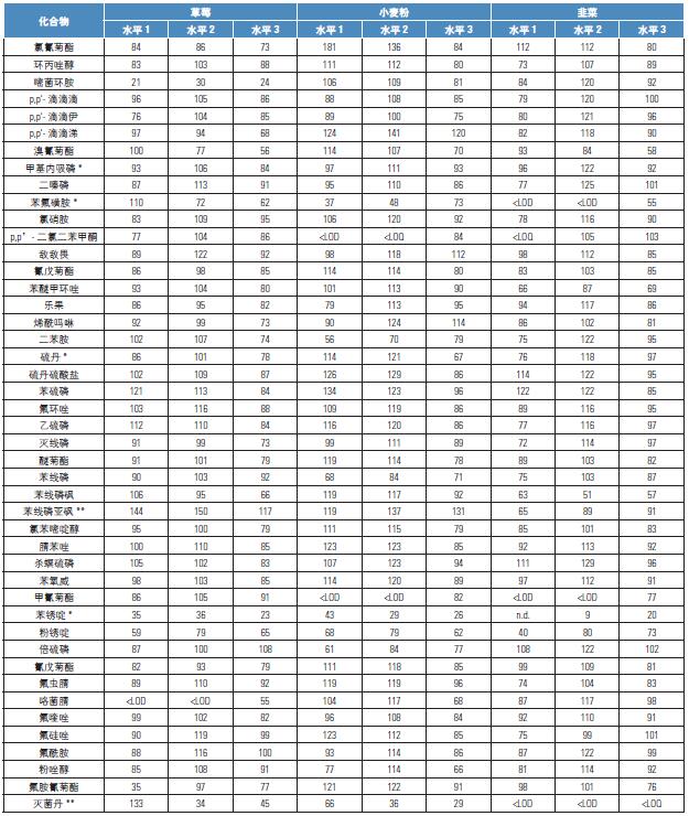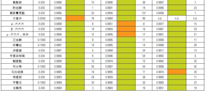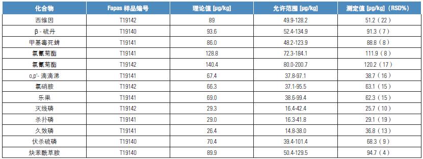 注意:FAPAS 樣品的選擇主要是基于目標農藥成分的含量。但是由于樣品有限,選擇的基質與驗證的基質稍有不同。