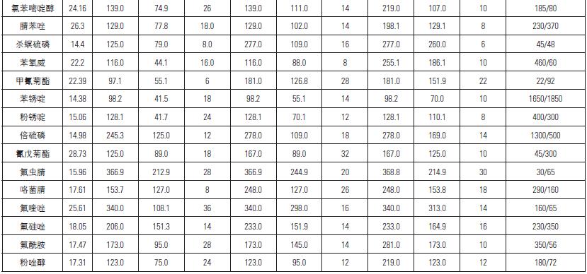 所有單個的農藥化合物均購自Sigma-Aldrich® ( 德國) 和Laboratory Instruments Srl ( 意大利CASTELLANA GROTTE),包括乙酰甲胺磷、氟丙菊酯、雙甲脒、保棉磷、嘧菌酯、聯苯菊酯、聯苯三唑醇、啶酰菌胺、溴螨酯、溴菌唑、乙嘧酚磺酸酯、噻嗪酮、硫線磷、克菌丹、西維因、克百威、萎銹靈、蟲螨腈、毒蟲畏、乙酯殺螨醇、百菌清、氯苯胺靈、乙基毒死蜱、甲基毒死蜱、氟氯氰菊酯、三氟氯氰菊酯、氯氰菊酯、環丙唑醇、嘧菌環胺、滴滴滴、滴滴伊、滴滴涕、溴氰菊酯、甲基內吸磷、二嗪磷、苯氟磺胺、氯硝胺、二氯二苯甲酮、敵敵畏、開樂散、苯醚甲環唑、樂果、烯酰嗎啉、二苯胺、硫丹、硫丹硫酸鹽、苯硫磷、氟環唑、乙硫磷、滅線磷、醚菊酯、苯線磷、苯線磷砜、苯線磷亞砜、氯苯嘧啶醇、腈苯唑、殺螟硫磷、苯氧威、甲氰菊酯、苯銹啶、丁苯嗎啡、倍硫磷、氰戊菊酯、氟蟲腈、咯菌腈、氟喹唑、氟硅唑、氟酰胺、粉唑醇、氟胺氰菊酯、滅菌丹、α- 六六六,β- 六六六,γ- 六六六(林丹)、己唑醇、抑霉唑、異菌脲、甲基異柳磷、醚菌酯、利谷隆、馬拉硫磷、嘧菌胺、甲霜靈、蟲螨畏、甲胺磷、殺撲磷、滅蟲威、嗪草酮、久效磷、腈菌唑、鄰苯基苯酚、噁草酮、噁霜靈、多效唑、甲基對氧磷、對硫磷(乙基)、甲基對硫磷、二甲戊靈、氯菊酯、稻豐散、伏殺硫磷、亞胺硫磷、磷胺、抗蚜威、對脫甲基抗蚜威、甲基嘧啶磷、咪酰胺、腐霉利、丙溴磷、炔螨特、丙環唑、炔苯酰草胺、丙硫磷、唑菌胺酯、噠螨靈、嘧霉胺、吡丙醚、喹氧靈、螺螨酯、戊唑醇、蟲酰肼、吡螨胺、七氟菊酯、四氟醚唑、三氯殺螨砜、四氫酞酰亞胺、噻苯咪唑、甲基立枯磷、甲苯氟磺胺、三唑酮、三唑醇、肟菌酯、氟樂靈、滅菌唑、乙烯菌核利。