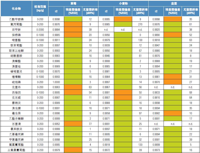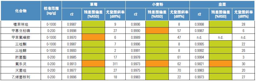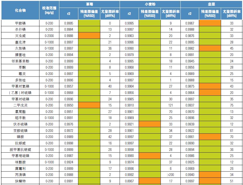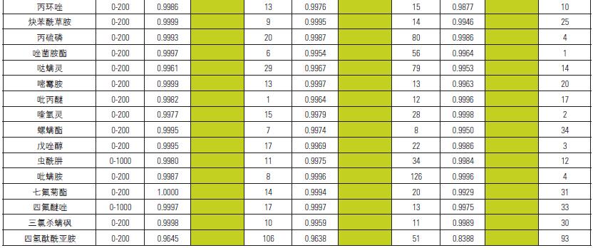 校準曲線建立在六個濃度水平上(基質匹配),每個濃度平行進樣兩次。根據所有基質和內標物的校準曲線,在整個校準范圍內計算了累加平均響應因子做為內標的Rf 值。校準濃度范圍分別為0-200,0-1000 和0-2000 ng/g 的三組化合物(取決于相關MRL 值)分別制備了校準曲線(具體結果見表3)。校準標樣濃度水平的選取為校準曲線范圍內等距離分布。線性函數采用曼德爾擬合方法,曲線殘差應小于可接受限的20%3。此外,由于沒有相關法規的規定,將相關系數值的最低限設定為0.985。由于與校準標樣濃度水平相關的LOQ 值太高,設定標準不適合甲氰菊酯和苯氟磺胺(LK),以及炔螨特(WF)。沒有采用加權函數。