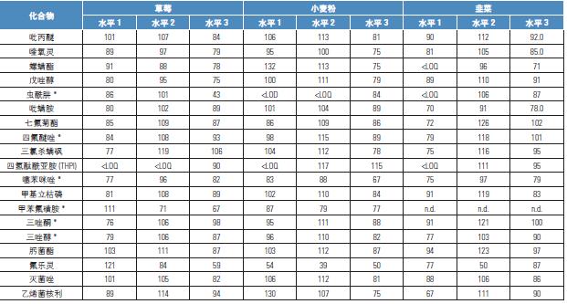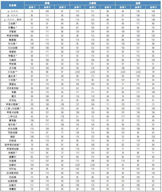 * 加標濃度為50,100 & 500 ng/g ** 加標濃度為100,200 & 1000 ng/g <LOD/LOQ – 加標量低于LOD/LOQ 值