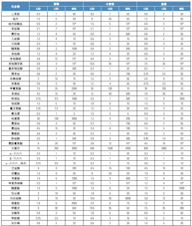 本方法驗證研究的目的是證明一種能應用在一些有代表性的基質(草莓、小麥粉和韭菜)中的多農藥殘留(大約140 種優先的農藥)的日常分析的完整工作流程及解決方案(由Thermo Scientific 化學品、消耗品和儀器提供)。此方法符合現行法規的要求,方法的檢出限(LOQ)與MRL 值一致,具有良好的靈敏度1-4。