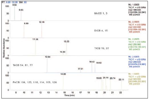 圖1. 一個(gè)PCB 標(biāo)準(zhǔn)品從一氯代到五氯代PCB 的提取離子色譜圖(柱上1 pg)