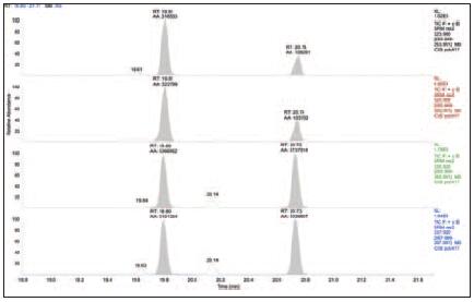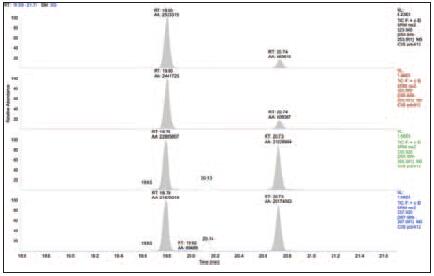TSQ Quantum XLS 三重四極桿質(zhì)譜儀在標(biāo)準(zhǔn)分辨率模式下(0.7 Da 峰寬)得到的這些SRM 質(zhì)譜圖與利用氣相色譜和高分辨質(zhì)譜儀(GC-HRMS)得到的數(shù)據(jù)顯示出很好的相關(guān)度。 如圖3 所示的五氯代PCB 的情況,通過使用基于兩個(gè)不同一級離子的獨(dú)立離子對,本TSQ Quantum XLS 方法能夠達(dá)到歐盟指令所要求的高確定性。 而即便在每個(gè)SRM 窗口中都平行監(jiān)測兩個(gè)氯代度時(shí),TSQ Quantum XLS 分析器的高運(yùn)行速度也能為每個(gè)色譜峰提供至少6 到8 個(gè)數(shù)據(jù)點(diǎn)。這使得色譜峰的積分和定量的結(jié)果都十分可靠。