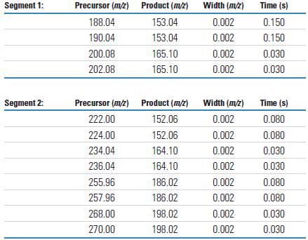 我們監(jiān)測的是基于分子離子 (12C12H10-x 35Clx) 相對于 37Cl 同位素即 (12C12 H10-x 35Clx-1 37Cl) 經(jīng)碰撞誘導(dǎo)解離(CID) 碎裂過程形成的丟失了兩個(gè)氯的二級離子的離子對(表3)。同位素內(nèi)標(biāo)也用相同方法檢測,不過,由于含有12 個(gè)13C 標(biāo)記,所以有12 道爾頓的質(zhì)量位移。