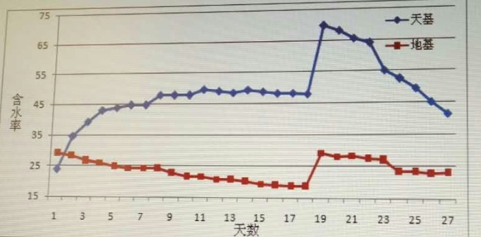 當(dāng)再次澆水后,水分急劇增加,打破原來的水分平衡,會(huì)出現(xiàn)高峰值并開始逐漸下降,這跟地基所測(cè)定的曲線圖是比較吻合的,圖中顯示為19-27天的曲線過程。