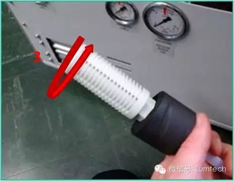 1.拆下過濾器外部連接管。向上按住街頭藍(lán)色部分,拔出連接管。