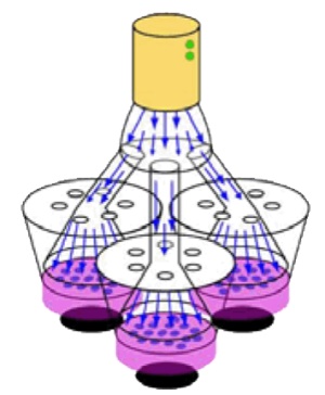 考慮到這些缺點(diǎn),細(xì)胞培養(yǎng)小室和氣溶膠入口分布需要進(jìn)行根本性的改變。為了避免受試顆粒物暴露的不均勻性,Cultex推出全新概念的二代暴露染毒模塊Cultex RFS(圖4、圖5)。