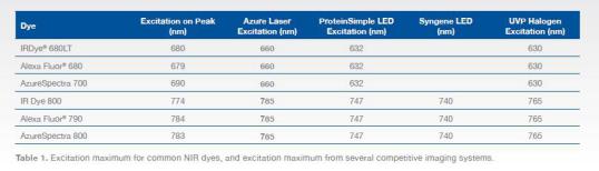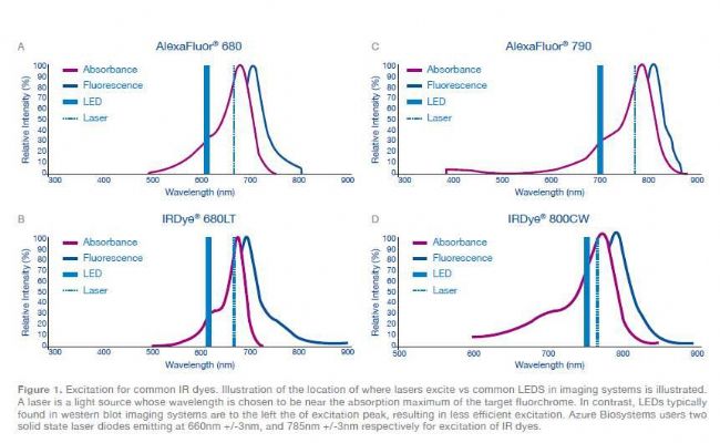 例如染料 IR Dye® 700 和Alexa Fluor® 680 在685nm處有個(gè)最大吸收峰(圖1A, 1B,和 表1).Azure Biosystems cSeries成像系統(tǒng)帶有660nm激光光源,而使用LED或者白光(氙燈和鹵素?zé)簦┑募ぐl(fā)光源在630nm左右,染料激發(fā)不完全。
