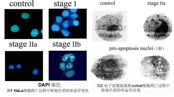 凋亡細(xì)胞體積變小,細(xì)胞質(zhì)濃縮。細(xì)胞凋亡過程中細(xì)胞核染色質(zhì)的形態(tài)學(xué)改變分為三期:Ⅰ期的細(xì)胞核呈波紋狀(rippled)或呈折縫樣(creased),部分染色質(zhì)出現(xiàn)濃縮狀態(tài);Ⅱa期細(xì)胞核的染色質(zhì)高度凝聚、邊緣化;Ⅱb期的細(xì)胞核裂解為碎塊,產(chǎn)生凋亡小體。