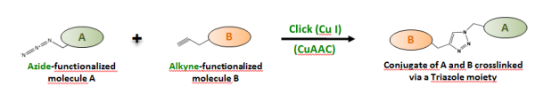 點擊化學的原理是在一定環境條件(溫和、含水)下,一對功能性基團彼此快速、有選擇性地相互反應(“咔嚓”)。即兩個相兼容的具有點擊功能基團A和B被激活,被激活的兩個分子形成穩定的偶聯體。