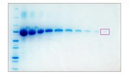 圖2:考馬斯亮藍染色的凝膠,純化的轉鐵蛋白經過一系列的稀釋從5000ng-5ng,使用4-15%的Tris-Gly凝膠進行分離,使用考馬斯亮藍染液進行染色,方框展示的是10ng的蛋白。